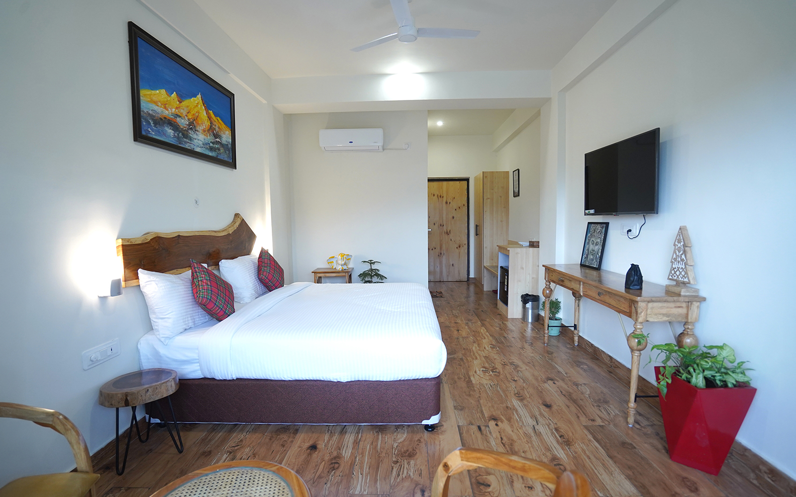 Spacious, airy rooms thoughtfully designed for comfort — with large windows and a private balcony offering serene views of Bhimtal Lake.